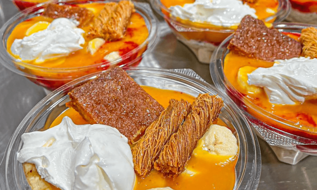 The mango dessert is basically rice pudding covered in mango, strawberry, apple, and banana juice. It is topped with clotted cream and served with basbousa and rolled konafa. Not only will you get that dose of mango, but a sugar rush will follow.