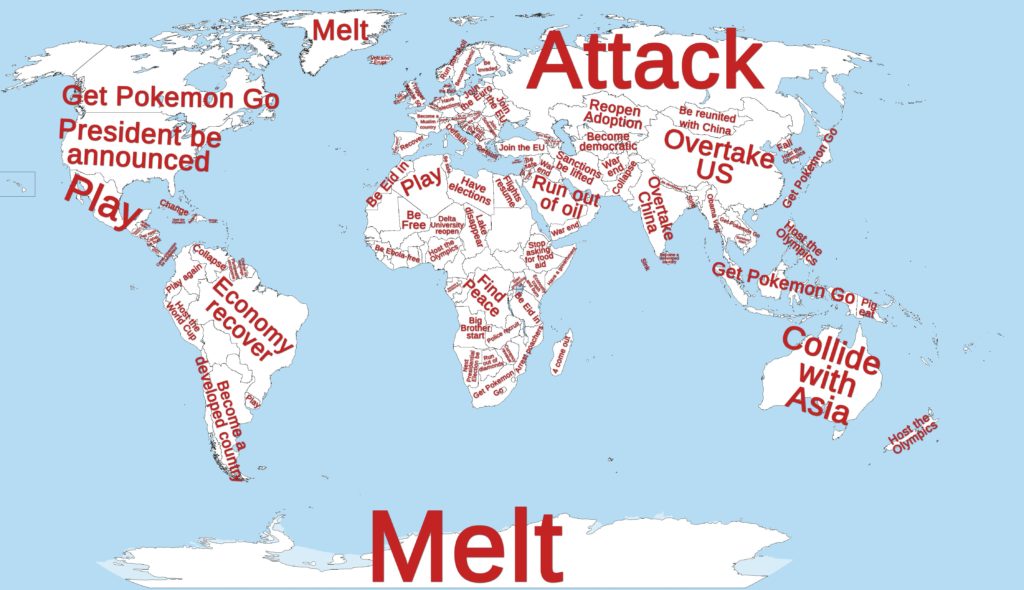 As you can see, people all over the world are worried about when they’ll be getting Pokemon Go amidst actual concerns like Saudi Arabia running out of oil, Egypt wanting flights to resume, Brazil’s economy recovering and Australia colliding with Asia.
