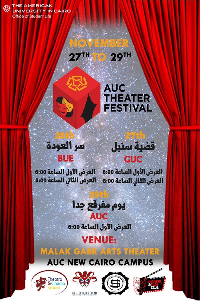The renowned Malak Gabr Theater Hall in the American University in Cairo is going to witness true art this month, and you should make sure you won’t miss it! Three theater clubs from three of the top universities in Egypt are coming together for the first ever AUC Theatre Festival. The Theater Team of the British University in Egypt, the Theater and Cinema School of the German University in Cairo, and the Theater and Film Club of the American University in Egypt collaborated to make this exceptional event come to life!