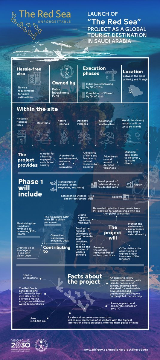 Sources have confirmed that Saudi Arabia is developing a huge tourism project, along its Red Sea coastline. The project is expected to attract travelers from all over the world. The project is likely going to be located between the two cities of Umluj and Al Wajh. The project will cover 50 islands, and 34,000 square kilometers. The project is part of a larger and more comprehensive plan to transform the country’s economy, by reducing its reliance on oil.