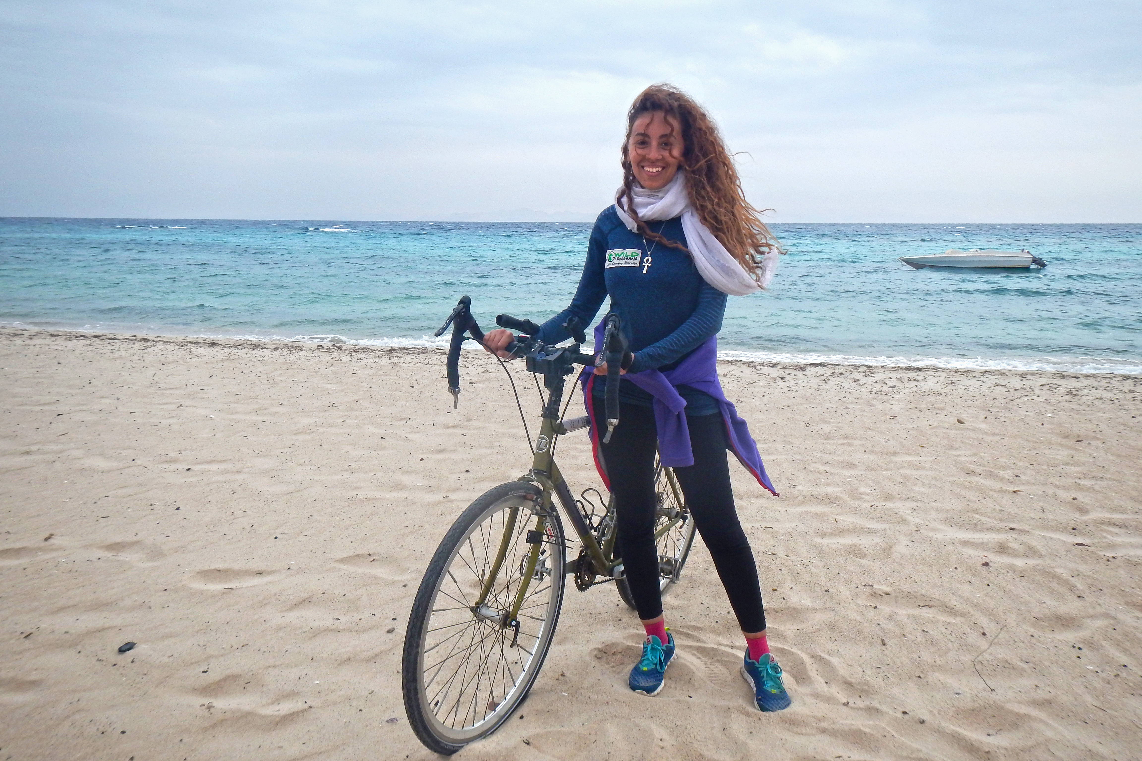 One of the main obstacles Hamsa faced on the road was the wind. Since her trip, that was planned to be in October, and was postponed several times to end up being in December, the weather was a problem. The weather was changing at that time and the forecast she checked beforehand totally changed after she was already on the road. Facing extremely strong wind for the first three days slowed her down. She ended up cycling for nine to eleven hours a day on average, resulting in some injuries due to the extra strain she put on her muscles and nerves. Not to mention that she was also sitting on a second degree burn since day two. Her serious need for medical care forced her to take a not-so-easy decision; she had to take a car from Ras Ghareb to Hurghada, took a ferry to Sharm, and got herself checked there. The decision was so hard it brought her down to tears, but she eventually accepted it and listened to her body.