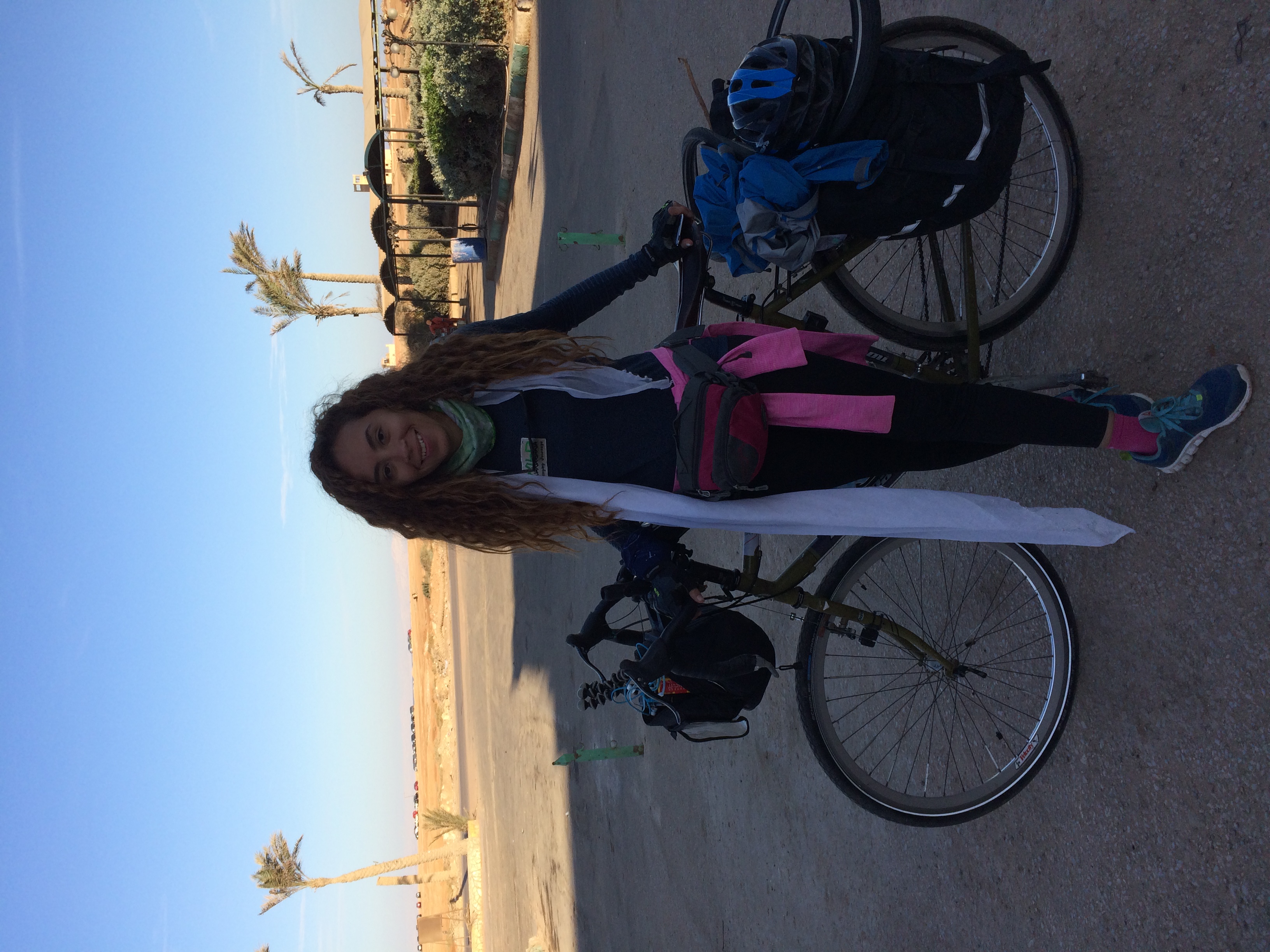 One of the main obstacles Hamsa faced on the road was the wind. Since her trip, that was planned to be in October, and was postponed several times to end up being in December, the weather was a problem. The weather was changing at that time and the forecast she checked beforehand totally changed after she was already on the road. Facing extremely strong wind for the first three days slowed her down. She ended up cycling for nine to eleven hours a day on average, resulting in some injuries due to the extra strain she put on her muscles and nerves. Not to mention that she was also sitting on a second degree burn since day two. Her serious need for medical care forced her to take a not-so-easy decision; she had to take a car from Ras Ghareb to Hurghada, took a ferry to Sharm, and got herself checked there. The decision was so hard it brought her down to tears, but she eventually accepted it and listened to her body.