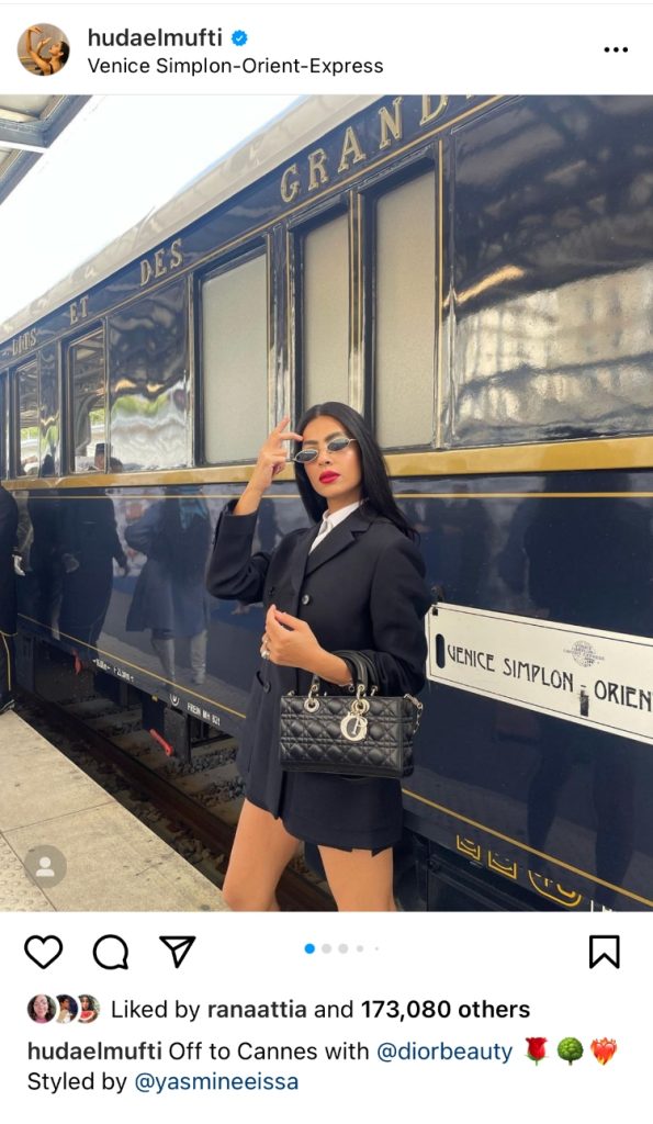 Rising to fame in 2017, with her breakout role in Haza Al Masaa (This Evening), 27-year-old Egyptian actress Huda El Mufti has also been a prominent face of several brand campaigns. The biggest was Dior’s 2021 perfume campaign where El Mufti represented their Tobacolor fragrance. She also represents the Dior brand globally; during her 2021 trip to Cannes when she was accompanied by Dior Beauty’s latest line of products while on the Venice Simplon Orient Express.