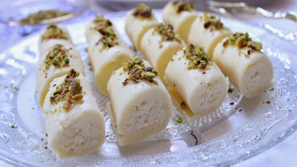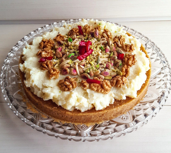 It’s a very popular Lebanese dessert, made of semolina and cheese dough, filled with custard-like heavy cream. The cheese dessert is often drizzled with rose water or sugar syrup and is usually garnished with cherries or nuts; especially pistachios.