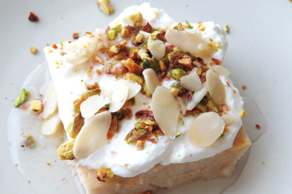 It’s made of semolina and soaked in sugar syrup. Sometimes, the syrup is flavored with coconut or rose water, depending on your taste. It can be eaten plain, with nuts, or cream.