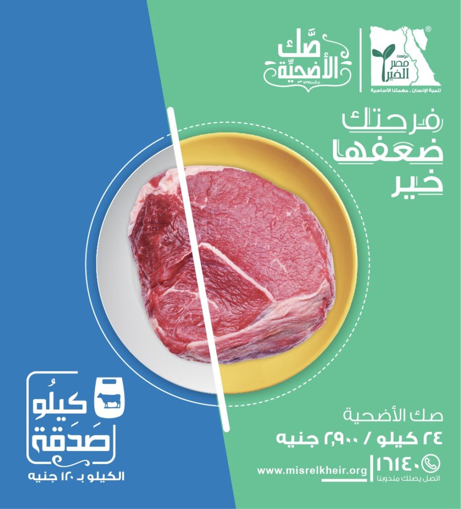 This year, Misr El Kheir is launching “Kilo Sadaka” for the first time. Their latest offering targets people who are unable to purchase the sacrificial instrument, to give them the opportunity to donate meat to the poor, as it only costs EGP 12o/kg.