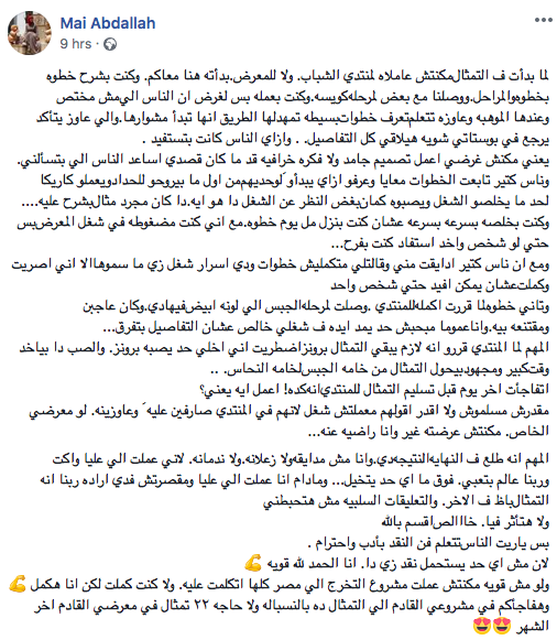 My goal was not to create an exceptional statue, it was only to help others. Many followed my steps and learned how to create something on their own from scratch. The statue was just a demo that I used to explain these steps. I was working in a rush to post daily steps and I was also busy with the exhibition. Many told me it was not smart to share my tips and tricks, yet I only wanted to help others. The second step was trying to finish it for the forum. I reached the white plaster cast phase. They admired it. I usually don’t like anyone to touch my work because details matter. The forum decided that the statue had to be in bronze, I knew it would take time, however, I was surprised a day before delivery that it looked like this. What could I have done? Not deliver? I couldn’t have said I can’t deliver as the forum sponsored the work and they wanted it. If it was my own exhibition, I wouldn’t have displayed it. In the end, this is the result. I am not sad and I do not regret anything because I did everything I could and only God can tell how hard I worked. As long as I did what I could, yet the statue was ruined then it’s God’s will. The negative comments won’t bring me down, I swear. However, I wish everyone can learn the art of criticism, as not everyone can withstand it. I am strong and if I wasn’t strong, Egypt wouldn’t have noticed my graduation project, neither would I complete my next project and surprise you all.