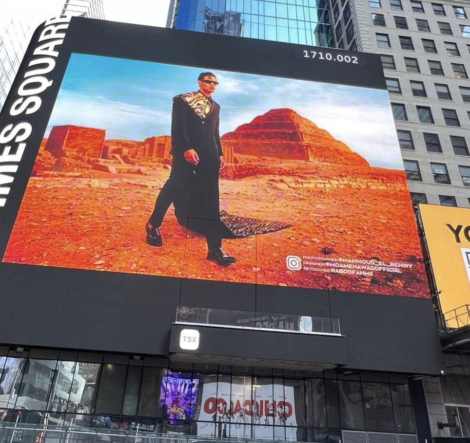 Egyptian fashion designer Moamen Awad has made history by becoming the first Egyptian fashion designer to showcase his work on the screens of Times Square in New York. This achievement comes after his latest collection, which was filmed in the Saqqara desert, and received accolades from people abroad.