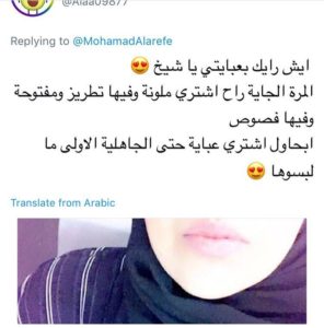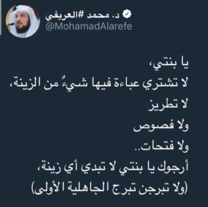 The tweet read: “Young girl, don’t buy a abaya that has any kind of embroidery on it. Please, don’t show any of them. Don’t dress up like the women in Jahiliya.”