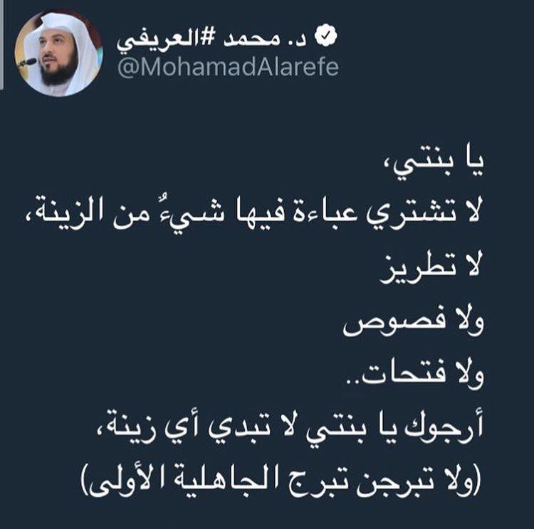 Mohamed Alarefe, one of the most popular Muslim scholars in the world — racking up 17.9 million followers on Twitter — has just posted a tweet on how girls should only wear simple abayas with no embroidery.