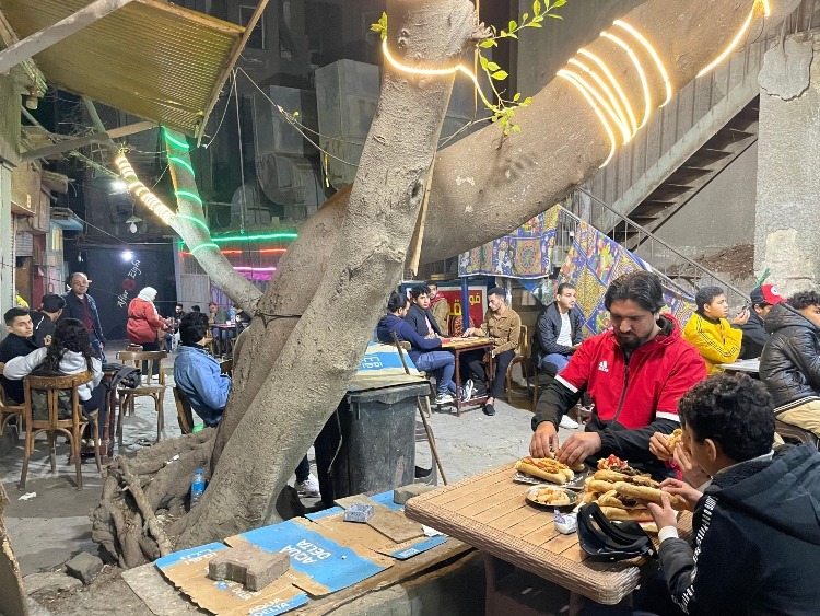 Hidden within a tight narrow alley that sits between Downtown Cairo’s Champollion and Kasr El Nile road is that very kebda cart. On entering the alley, what followed was a series of events that left the Scoop team dazed, confused but also quite amused. To truly picture the scene, imagine a long tree-lined narrow alley, each tree glowing up from spirals of green and yellow LED strips and in the spaces between are old, worn-out wooden and plastic tables as well as wooden coffee and plastic chairs. Standing tall at the entrance of the alley were two main attractions, a makeshift TV unit made of red coke crates and ofcourse, the infamous kebda cart emblazoned with a red neon sign that read “Mama Dahab” in Arabic.