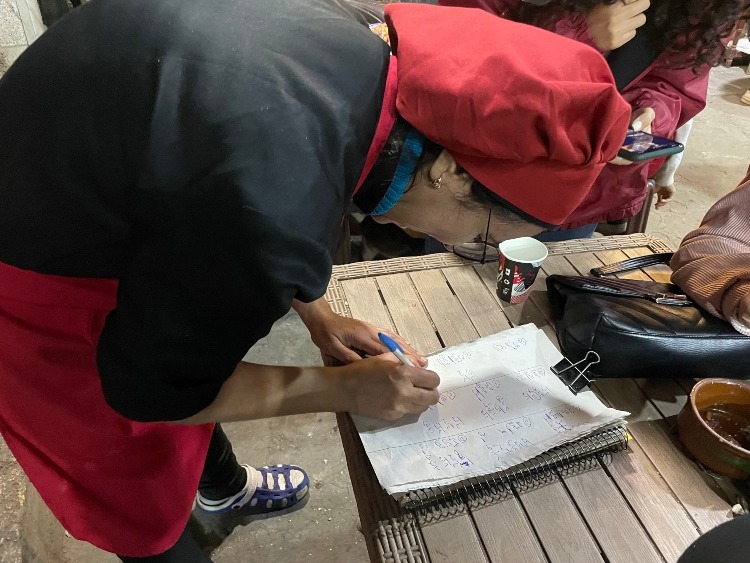 A long time passed before anyone took their order until once again, her voice boomed out from the center of the alley, “Bab el shaka etaafal aalina, ana delwaati halim el order” (The front door of the house is now closed and now I will start taking your orders). With a huge notebook at the ready, she began marching with determination from table to table, taking everyone’s order. At each table, she would make one of the customers get up so she can sit in their place and then scribble aggressively the customers order “Four kebda, two sogok, one french fry tagine”. Sometimes, she’d jokingly yell at customers who didn’t have their order ready, telling them she will come back again so they need to know what they’ll order. She repeated this lengthy process all by herself, no waitstaff on hand, for a total of 11 tables.