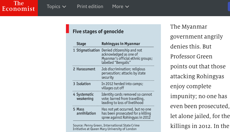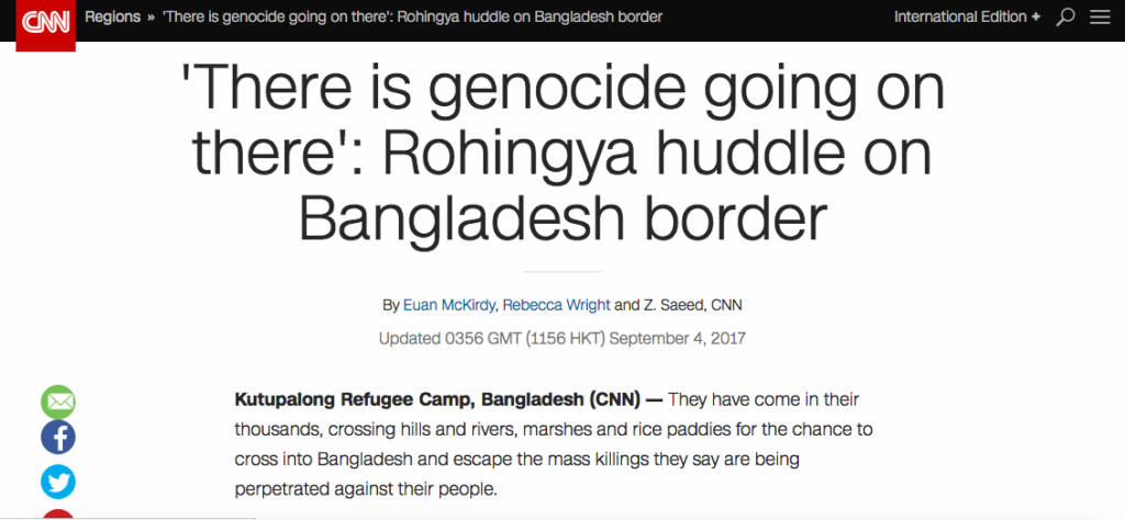 While I am sincerely disheartened by what is going in Burma, I am also taken aback by the kind of coverage provided by large media entities, like The Economist, and CNN. These entities are much more concerned with the technicalities of weather or not what is happening in Burma legally fits the definition of genocide. If Muslims were the perpetrators of these crimes, the verdict would already be in by this point.
