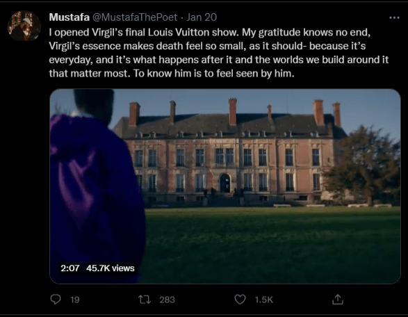 Mustafa posted the video on all his social media. Expressing his gratitude for the amazing opportunity to work on this highly artistic endeavor with other big names. In true Mustafa style, he goes on in the post intellectually explaining how the experience was behind the cinematic video on Virgil’s work saying “I opened Virgil’s final Louis Vuitton show. My gratitude knows no end, Virgil’s essence makes death feel so small, as it should- because it’s every day, and it’s what happens after it and the worlds we build around it that matter most. To know him is to feel seen by him.”
