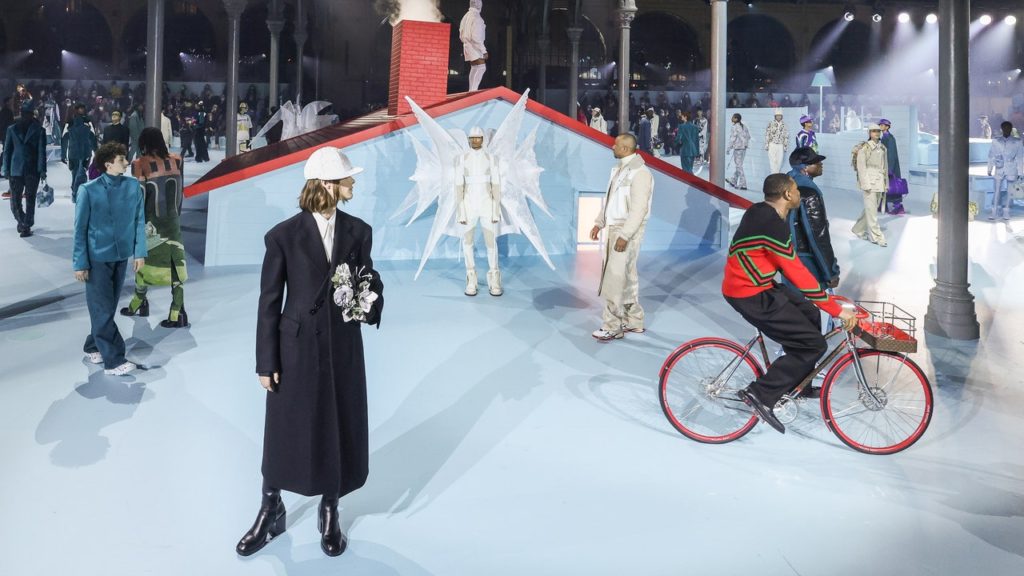 At Paris Fashion Week, Louis Vuitton presented the last men’s collection designed by its late Artistic Director, Abloh. He designed the fall-winter 2022 collection and its presentation format, which was carried out by the creative teams and collaborators that he continually worked with at the Fashion house. The show unfolded within a mesmerizing sky blue ‘Louis Dreamhouse™’, complete with a surreal arrangement of elements such as a long banquet table, a half-sunken house, a set of stairs, and a bedroom.