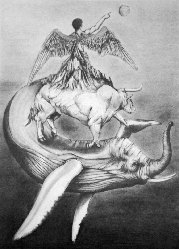 Bahamut is a giant and monstrous fish (or whale) that lies in the deep ocean. In this myth, it carries an angel that stands on a gemstone, which is supported by a bull, sometimes called Kuyutha, to balance the earth and sea and is suspended in water for its own stability.
