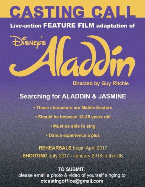 A longer casting call searching for the perfect Aladdin and Jasmine has also been posted online. “The Walt Disney Studios Motion Pictures live-action adventure musical feature film ‘Aladdin’ will be casting two unknown newcomers to play the lead roles of Aladdin and Jasmine. BAFTA Award winner Dan Lin is producing the film, and he has stated that the director will be looking to cast newcomers in the major roles of Aladdin and Jasmine, and that they will be discovering new people that must have acting and singing abilities.”