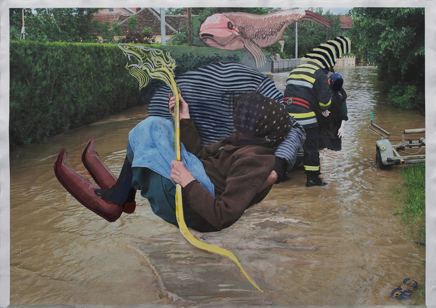 In this series, Haerizadeh takes printed stills of YouTube videos and news broadcasts of current events in the MENA region and paints on them to produce surreal and satirical scenes that double as political statements.