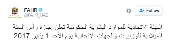 It gets better. Government departments and other public sector agencies will also be off to mark the New Year, according to a tweet by the Federal Authority of Government Human Resources.