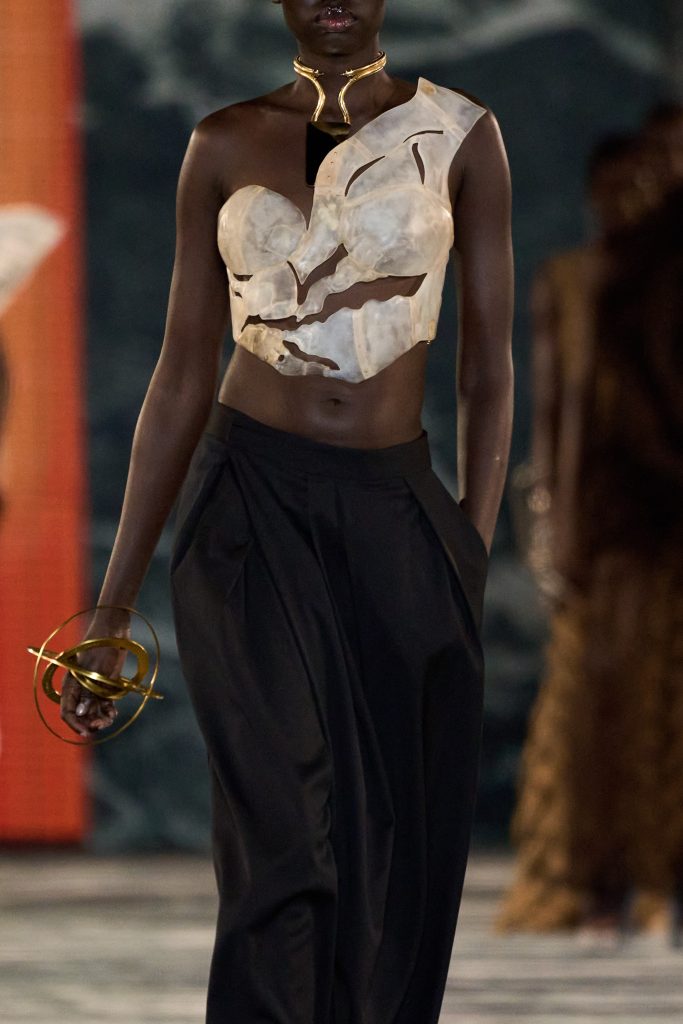 On September 28th at Balmain’s runway show unveiling its SS23 collection at the Stade Jean Bouin, Okhtein revealed a striking bustier, clearly referencing Egyptian alabaster stone and its unique semi-translucent qualities that have been made iconic through ancient Egyptian vases and sculptures that line museums across the globe. Building on Bolmain’s SS23 collection that seeks to rediscover and reinvent motifs and ideas from the Renaissance, and reframe in a a more modern lens, Aya and Mounaz, the sister duo behind Okhtein, pushed the focus towards North Africa and to the rich aesthetic and intellectual legacy left by ancient Egyptian civilisation. The sisters reflected on their collaboration with Bolmain, by describing how “Coming from Egypt, a country of rich heritage and history, the story combining both our vision and Olivier’s has been a truly wonderful experience.”
