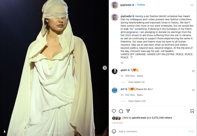 Hadid told Diet Prada that both circumstances are terrible and that more awareness is needed for individuals who have learned to tolerate the ongoing occupation in Palestine through time. She even went on to say that:
