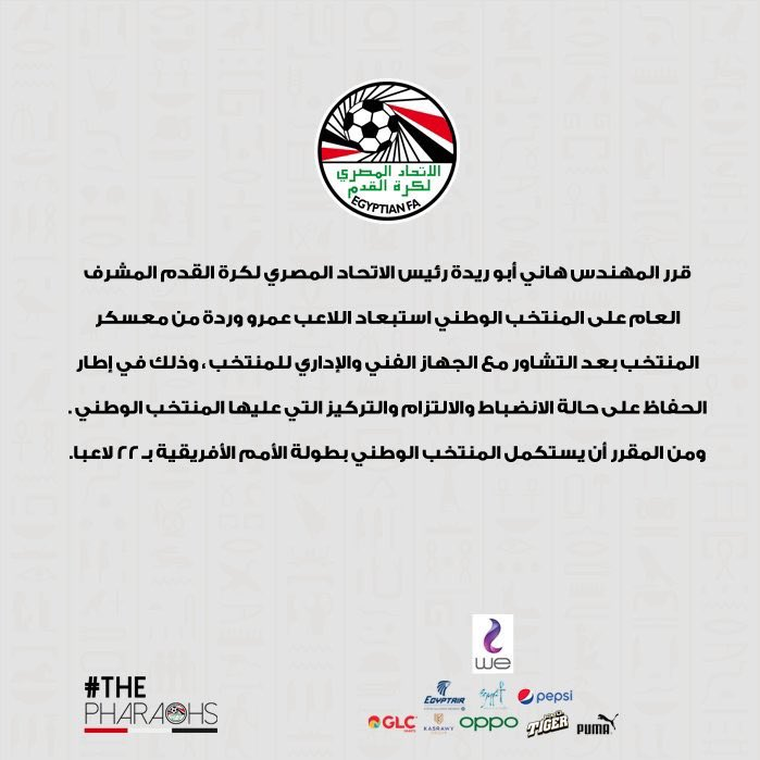 Public outcry called for Warda’s suspension, and the Egyptian Football Association (EFA) promptly released a statement, which read as follows: “The Head of the EFA Hani Abu Reda has decided to dismiss Amr Warda from the team’s camp after consulting with the team’s technical and administrative staff to preserve the national team’s state of discipline, focus, and commitment”.