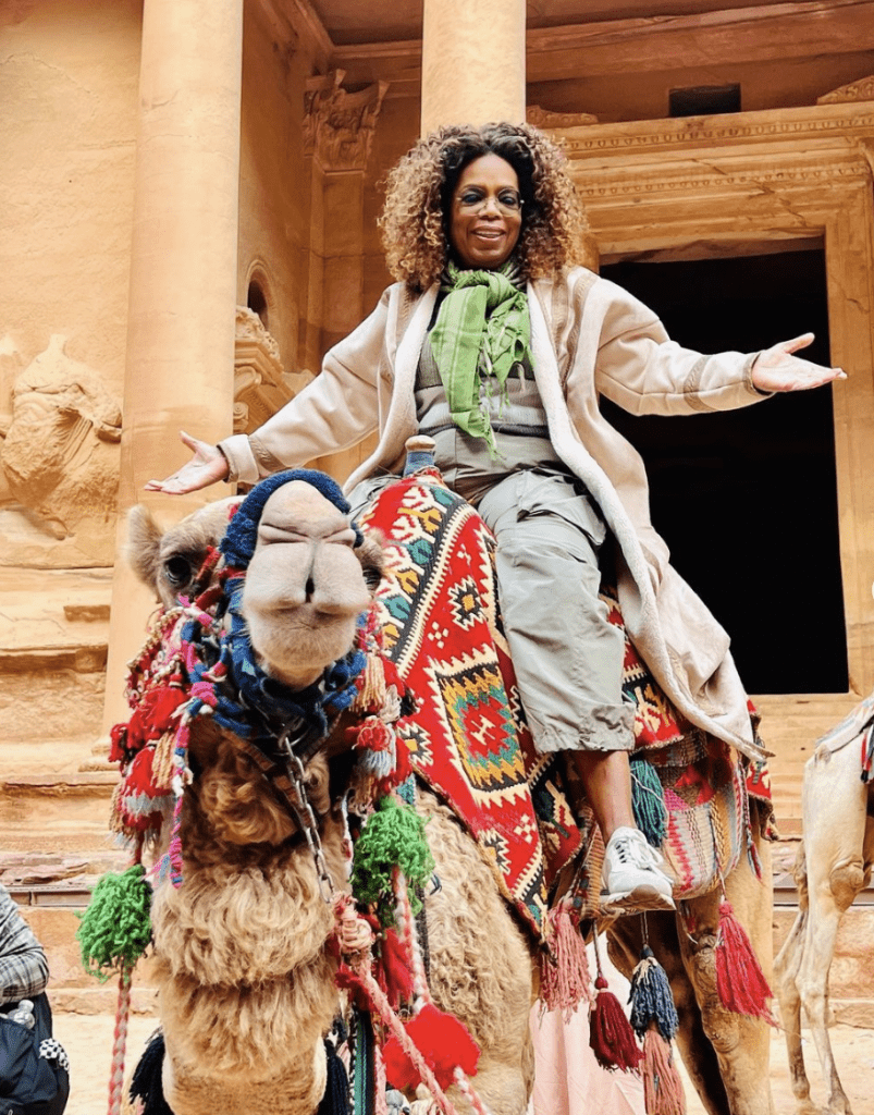 Sharing to her Instagram vibrant photos of her in Petra doing several excursions, Winfrey was seen riding a camel, visiting the site where John the Baptist baptized Jesus. In addition to galavanting across Indiana Jones’ picturesque boulders.