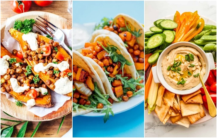 If your kid is a big hummus fan, they will love this lunchbox combination. It will include three versions of hummus, one as a sauce atop cooked sweet potatoes stuffed with chickpeas and tomatoes, one as a dressing atop butternut roasted chickpea wraps, and one as a dip accompanied by carrots, cucumbers, and tomatoes. It will be a very rich and healthy meal, especially great during the cooler months of the year.