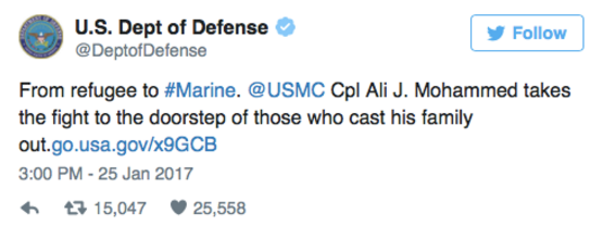 Yet amidst all the racism, misogyny and Islamophobia, The US Department of Defense praised a soldier who came to the US as a refugee. The department posted the inspirational story of Corporal Ali J Mohammed, a refugee who turned into a marine. This happened the same day Trump decided to prevent all Syrian refugees and Muslim Immigrants from entering the United States as part of national security. We’re not exactly sure what this means, but it seems that no one is on Trump’s side.