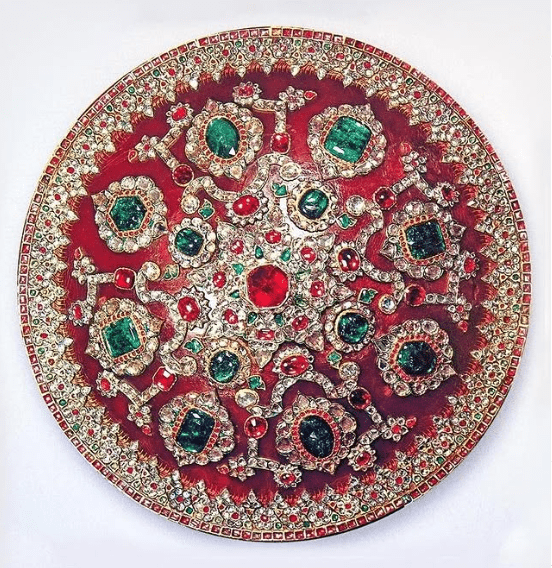 Among the most iconic pieces attributed to Nader Shah is his buckler, a shield made from rhinoceros hide and encrusted with emeralds, diamonds, and a striking red spinel. These jewels, while symbolizing military triumph, also reflected the extravagant tastes of Persian rulers.
