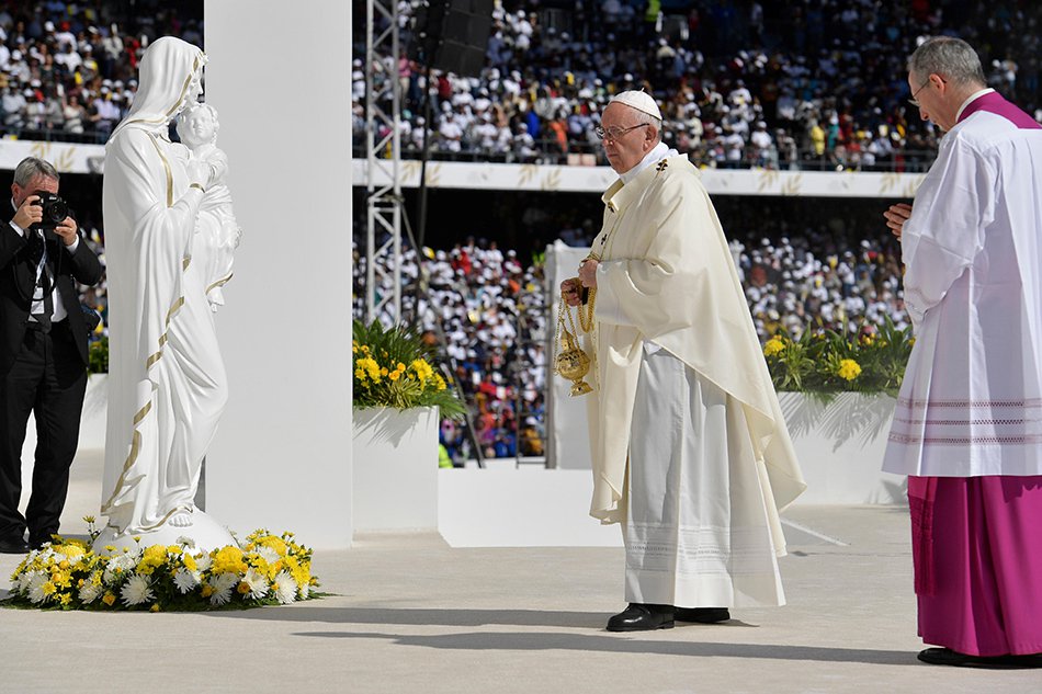 The pope made a grande entrance in a Mercedes Benz “popemobile” G-Wagen and waved at thousands of enthusiastic worshipers. A choir sang hymns as the Pope, as well as priests of different nationalities, began the service.