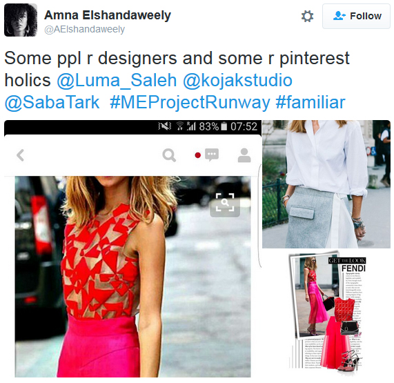 Then fellow contestant Amna ElShandaweely took to Twitter to expose Luma Saleh posting a Fendi look that looks exactly like Luma’s design suggesting that Luma stole the look from Pinterest and tagging her besties designers Saba Tark and Mohanad Kojak.