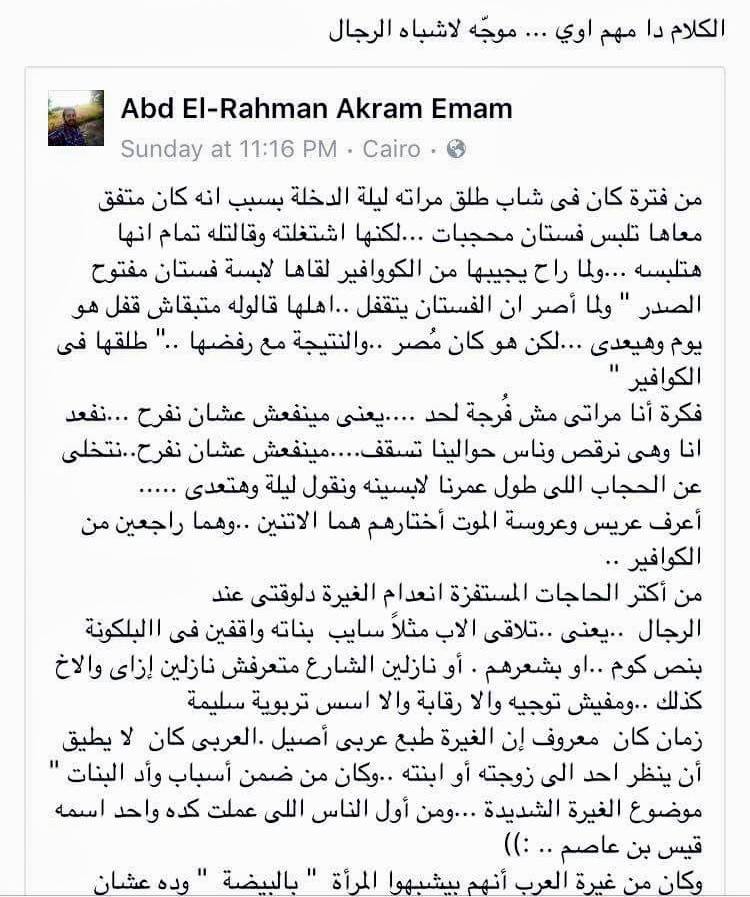There is a trend that has recently hit social media: this trend involves posts, comments, and tweets, surrounding the ideal of manhood, and what it truly means to be a man in Egypt. Specifically, there have been posts circulating online that describe modern Egyptian and/or Arab men as “Ashabah Regal” (Shadows of Men). This term is used on social media platforms to denote men who have abandoned the sexist ways of the past.