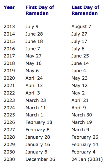 According to the lunar calendar, Ramadan moves back approximately 10 or 11 days every year. Social media just realized that in the year 2030, Ramadan is predicted to begin on January 6th and then again on December 26th. That means fasting twice in the same year for you!!