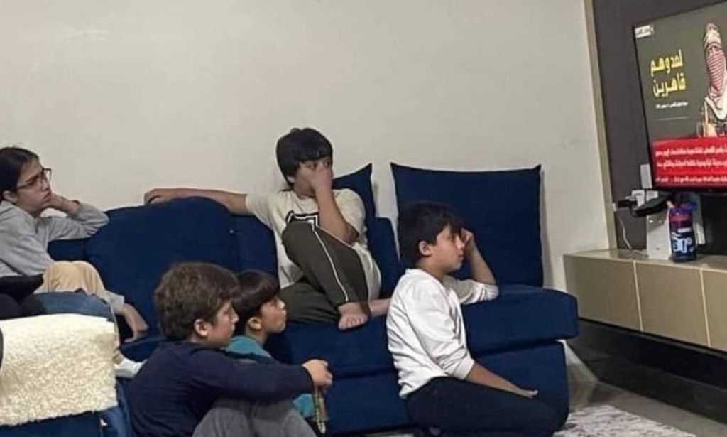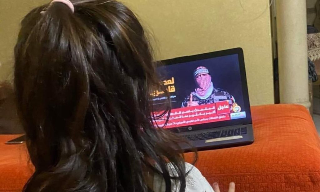 A TV in the living room is set on Al Jazeera channel that is streaming live footage from the Gaza strip all day long, it is the familiar background noise that the Egyptian homes have known since the melodies of the Palestinian resistance began. Children of different ages are playing, adults are talking when suddenly the sound of news reporting is interrupted by the voice of the leader of militia group Hamas, Abu Obaida. Everybody is now attentive to the voice, including the children, everybody is searching for something to cool their outrage down between the lines of Abo Obaida.