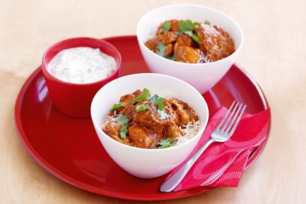 Divide rice between bowls. Spoon over curry. Top with coriander. Serve with raita.