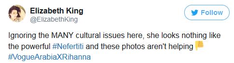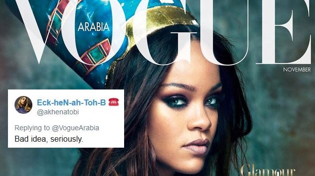 Rihanna, who has a tattoo of the Egyptian icon on her ribcage, wears a blue headdress and a textured lace coat on the cover of the magazine, which hits newsstands this Wednesday.