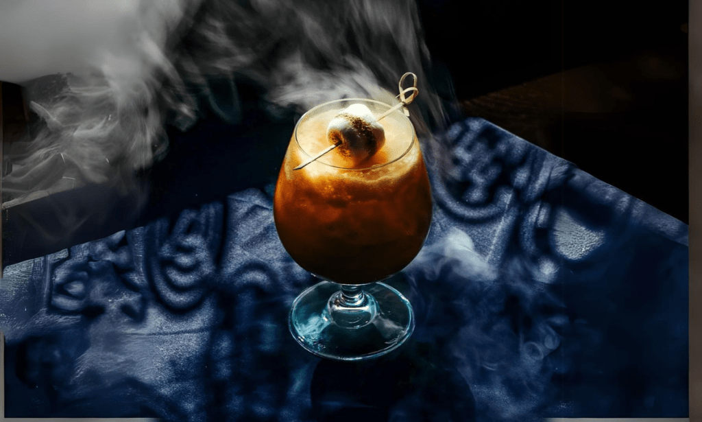 Drinking this mocktail is an experience in itself, as it’s served with steam wafting out of a glass cylinder, and inside is the drink made of pumpkin puree, lychee nectar, fresh passion, tobacco syrup, and coconut milk.