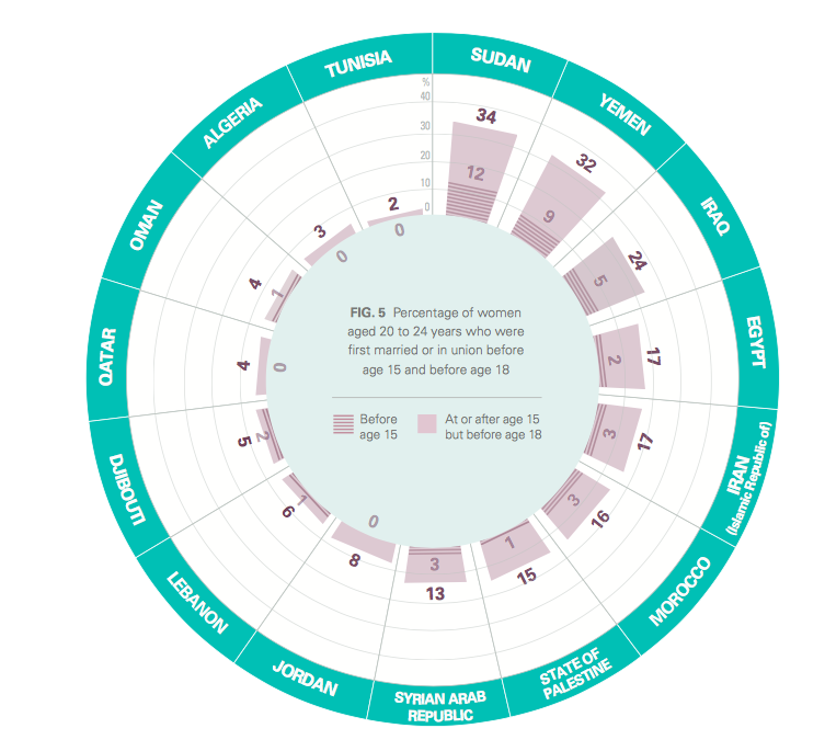 The prevalence of child marriage varies within the region, from one in three in Sudan and Yemen to 1 in 50 in Tunisia.