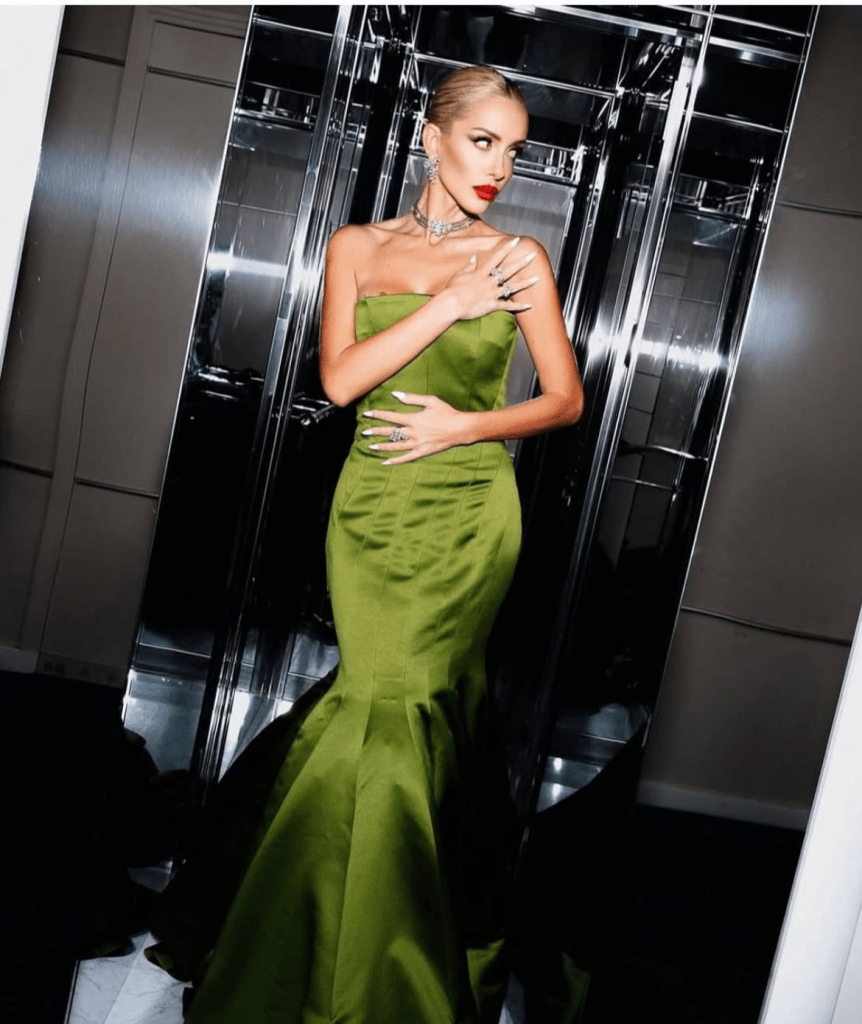 American Victoria’s Secret Angel Grace Elizabeth didn’t walk; she owned the Cannes red carpet. Her sculpted emerald gown from Waad Aloqaili Couture’s “Veil of Renewal” SS25 collection screamed peacock in the best way possible.