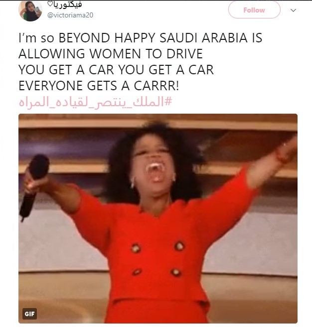 “I’m beyond happy Saudi Arabia is allowing women to drive. Everyone gets a carrr!,” another tweeted, sharing a popular Oprah Winfrey GIF.