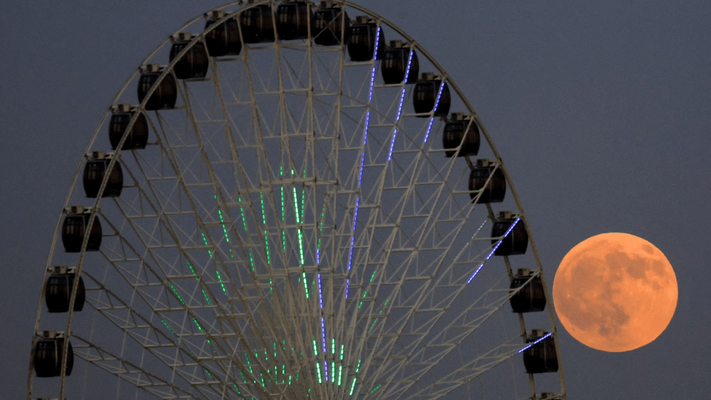 In Baghdad, Iraq, a lit Ferris wheel spun slowly as a pinkish full moon rose beside it. The playful energy of the carnival lights clashed yet blended with the calm glow of the sky. Together, they painted a scene that was both earthly and celestial at once.