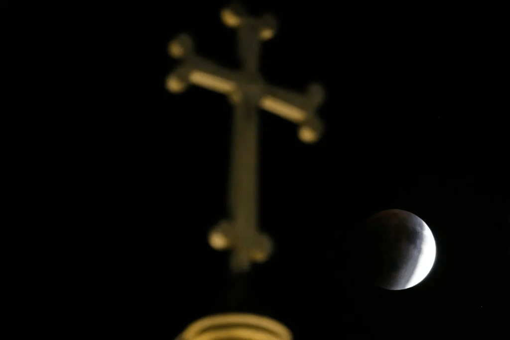 In Tehran, the Saint Sarkis Church became the stage for a beautifully symbolic shot. The cross stood blurred in the foreground while the eclipsed moon glowed quietly to the side. The image carried a sense of serenity, as if faith and the cosmos had paused to meet.