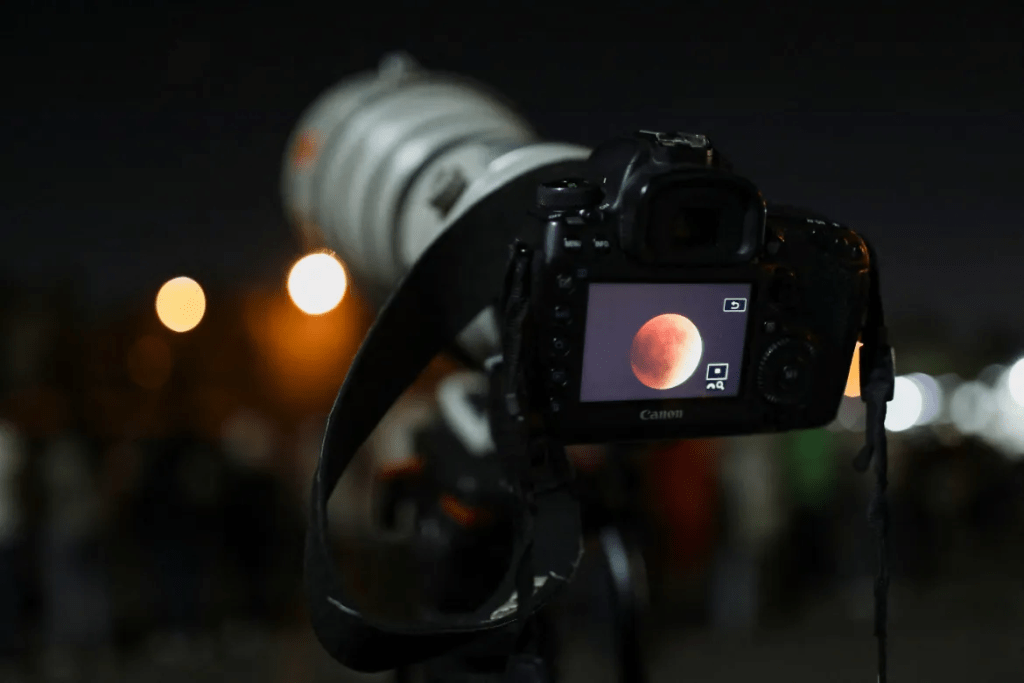 In Amman, the eclipse was captured through a camera screen, where the blood moon came into sharp focus. The background blurred into dreamy darkness, drawing the eye to the tiny glowing orb. It felt like peeking into a secret world that only the lens could reveal.