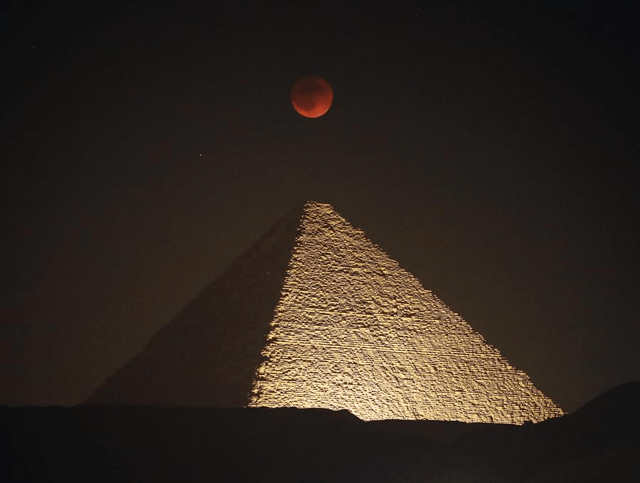 In Cairo, the blood moon perched gracefully above the pyramid of Khufu, glowing a deep scarlet against the night. One side of the monument shone brightly, while the other lay in shadow, making the whole scene feel like a painting.