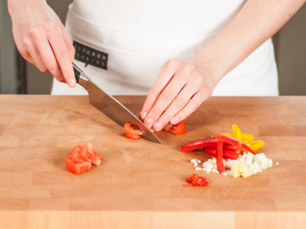 Dice the onion, garlic, ginger, tomatoes and chili. Then cut the bell peppers into thin strips. Heat some vegetable oil in a frying pan over medium heat, then add the onion, garlic, chili, and bell pepper to sauté until soft (from 6 to 8 minutes). Add ginger, spicy paprika, and cumin and cook for another two minutes.