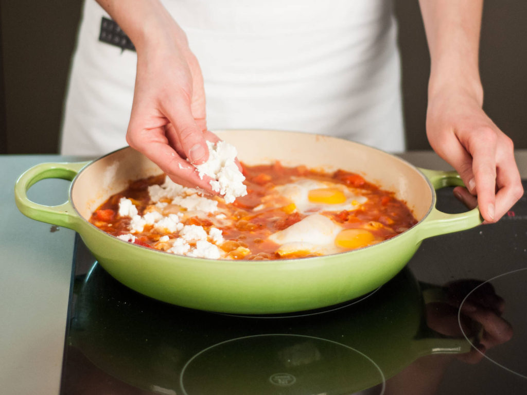 Add fresh tomatoes and canned tomatoes to the pan and lightly crush them with the cooking spoon. Preheat oven to 190°C/375°F. Add vegetable broth and cook over medium heat 20 minutes. Add in the Worcestershire sauce and season with salt and pepper. Finally, you can crack the stars of the show, eggs, into the pan, then crumble feta on top. Transfer to oven and bake at 190°C/375°F from 7 to 10 minutes until eggs have set. Remove from oven and garnish with fresh parsley to serve.