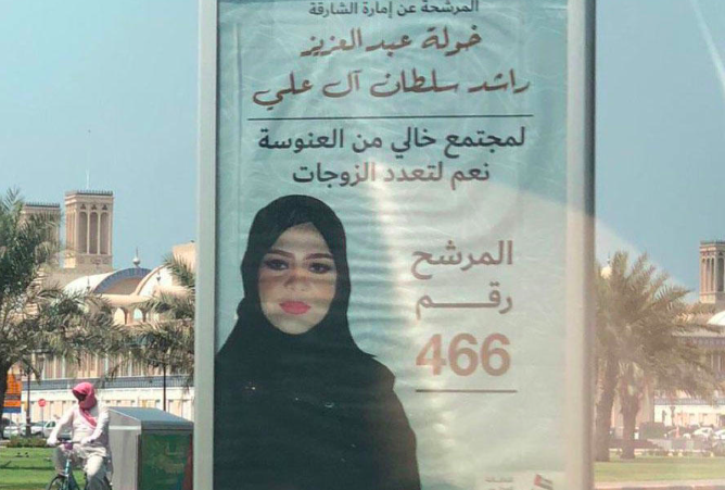 As the final 495 candidates launched their campaigns on Sunday, one lady caused a social media backlash. Sharjah’s candidate, Khawlah Al Ali, used the slogan “For a spinsterhood-free society, say yes to polygamy” for her election poster.