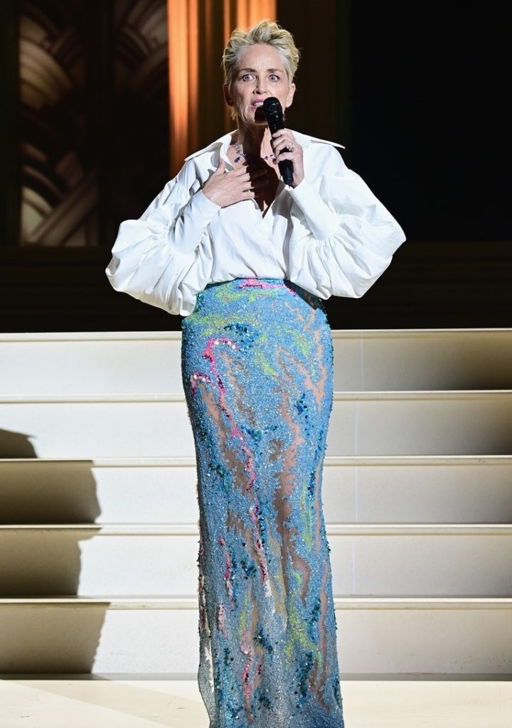 Stone rose to fame after starring in the movie Basic Instinct, in the role of Catherine Tramel. She hosted the 27th amfAR Gala, a charity event for raising funds for AIDS research, at the Cannes Film Festival. She was looking as fabulous as ever, wearing a popeline shirt mixed with cut-outs of embroideries from Ward’s couture fall-winter 2021/22 collection.