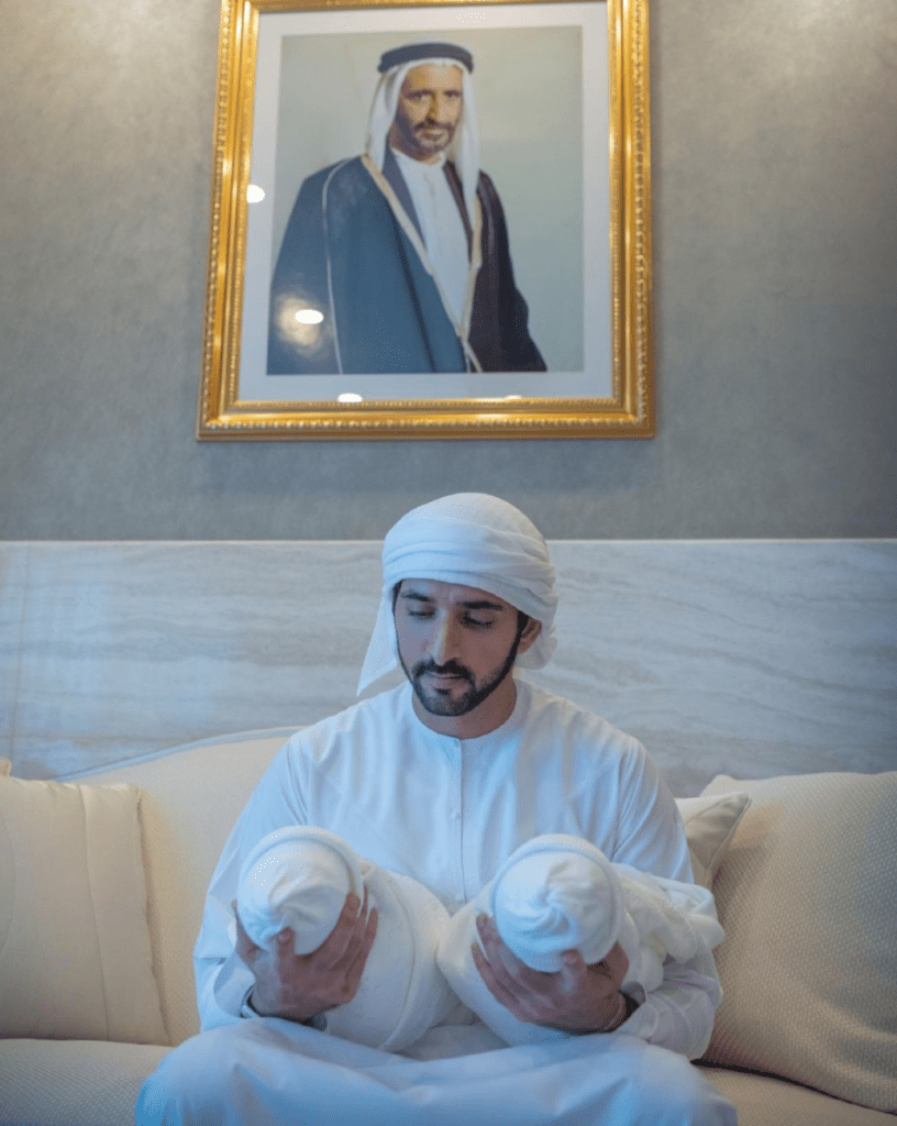 Yesterday was a celebration of the happiest news in Dubai! In a very cute Instagram post, His Highness Sheikh Hamdan bin Mohammed bin Rashid Al Maktoum, Crown Prince of Dubai and Chairman of the Dubai Executive Council, announced that he and his wife Sheikha bint Saeed bin Thani Al Maktoum were blessed with twins on Thursday, May 20, 2021. Rashid, the baby boy, and Sheikha, the baby girl, were seen wrapped in white in Sheikh Hamdan’s hands while he looked at them lovingly. A portrait of the late Sheikh Rashid bin Saeed Al Maktoum, can also be seen on the wall in the picture, suggesting the late grandfather watching over his grandson, the new father.